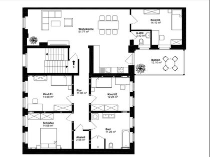 104 m² wohnfläche wohnzimmer mit balkon und übergang zu essbereich und küche ca.